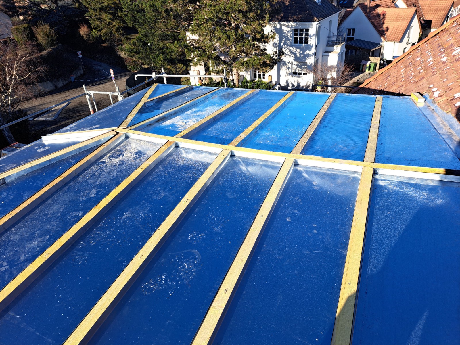 Nous avons effectué une pose dit " en tasseaux " permettant de créer des relevés et faciliter la pose des nouveaux bacs en zinc naturel pour qu'ils soient indépendant les uns des autres.