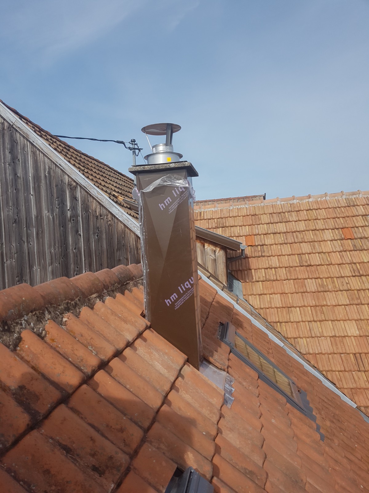 A Mietesheim proche de Haguenau, la réfection de la souche a été nécessaire car il y avait des infiltrations d'eau et cela a permis de vérifier les distances de sécurité autour du boisseau de cheminée afin de le rendre conforme pour l'installation de l'insert.